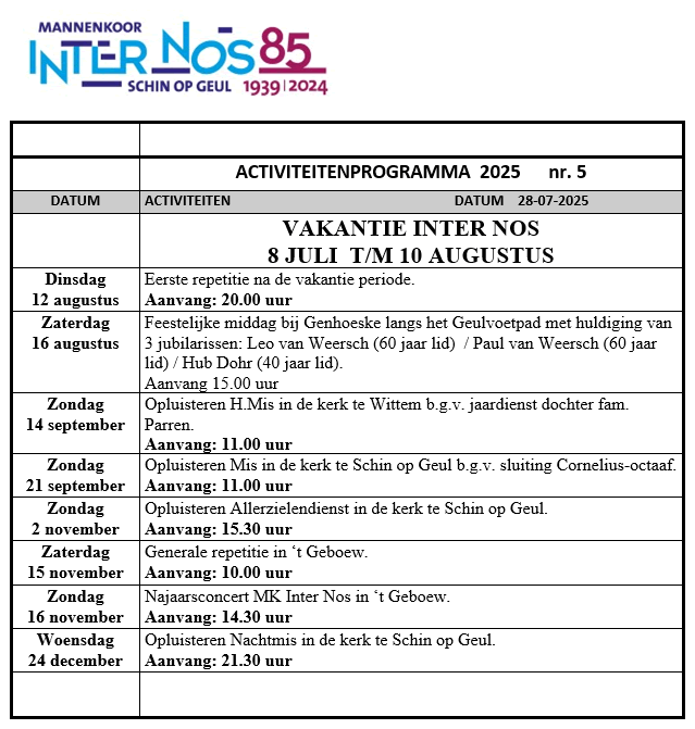 Meivakantie Heel Nederland 26 april t/m 4 mei 2025 Zomervakantie Regio Zuid 5 juli t/m 17 augustus 2025 Herfstvakantie Regio Zuid 11 oktober t/m 19 oktober 2025Kerstvakantie Heel Nederland 20 december 2025 t/m 4 januari 2026